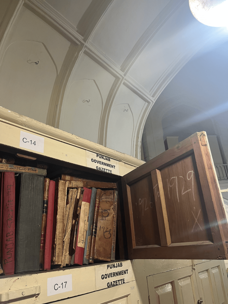 A new Director General has decided to make the tomb his office. He will be out of his position next month. White painted buildings are being demolished, the soft innards exposed everywhere; the offices are nowhere to be found. Construction workers, who here are more like demolition workers, use axes and hammers to bring down the old white walls, fitting to replace them with large lawns. The haphazard transference of archival material means that my questions around Jain Mandir and other temples across the city are roundly ignored. The archival records of the Punjab Archives are being removed from the specially made archival boxes to a comically small building, one which is surely not large enough to hold all the material. The construction dust and storage will probably leave its mark on the records.